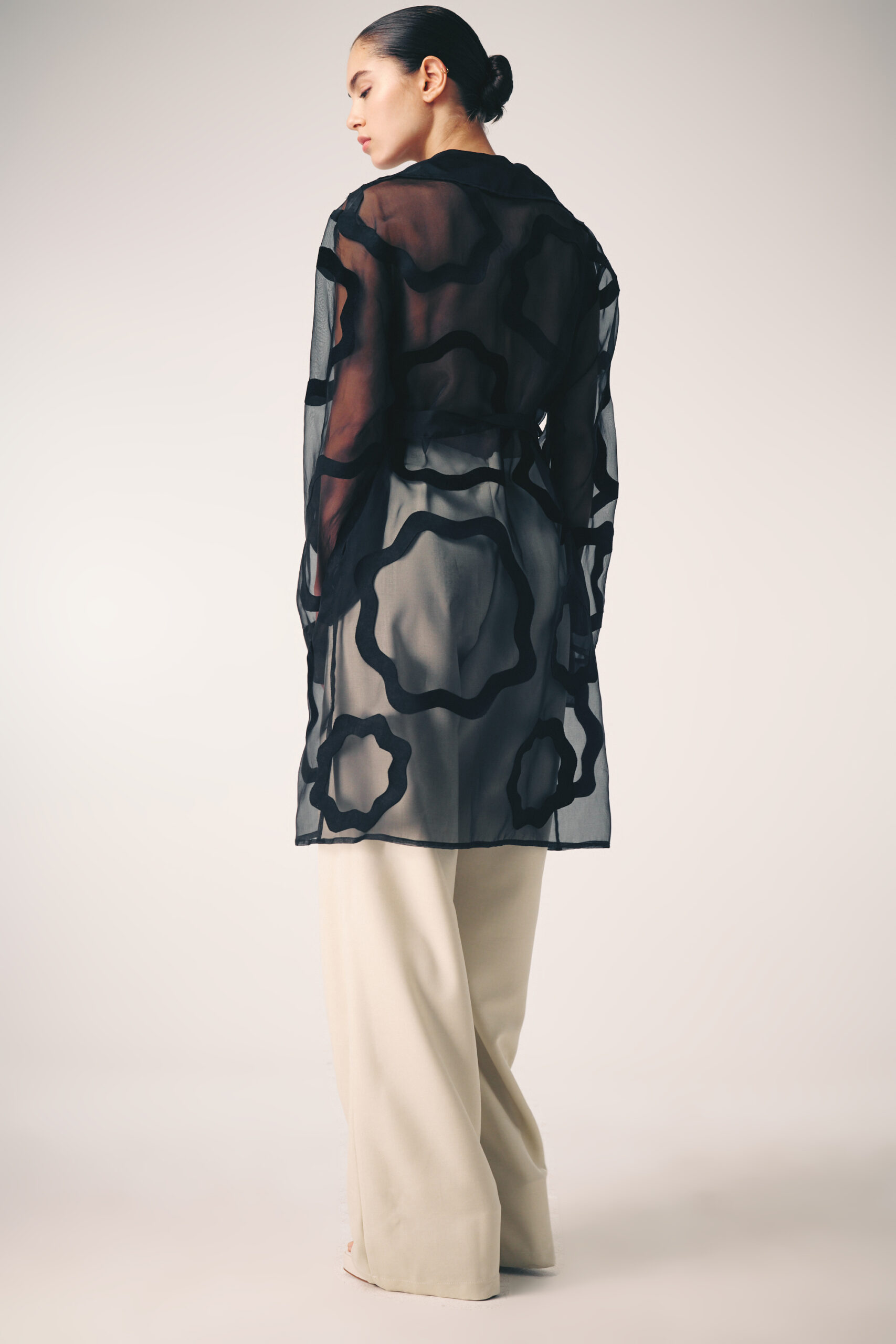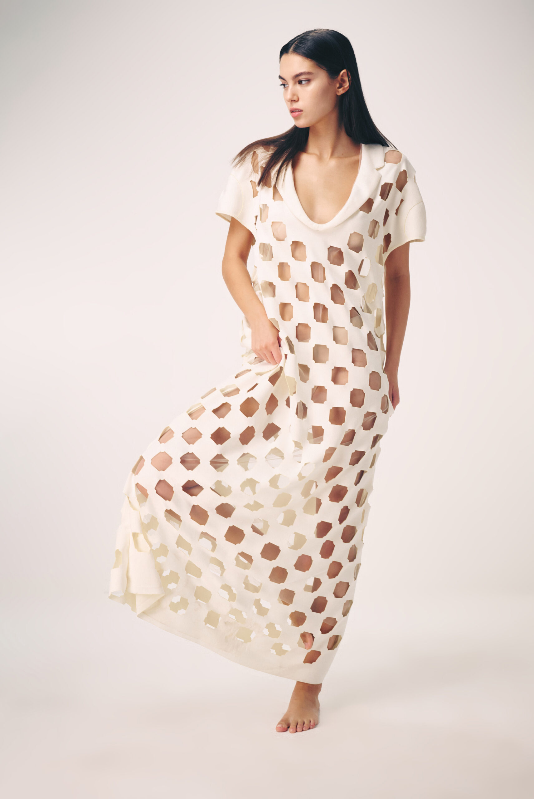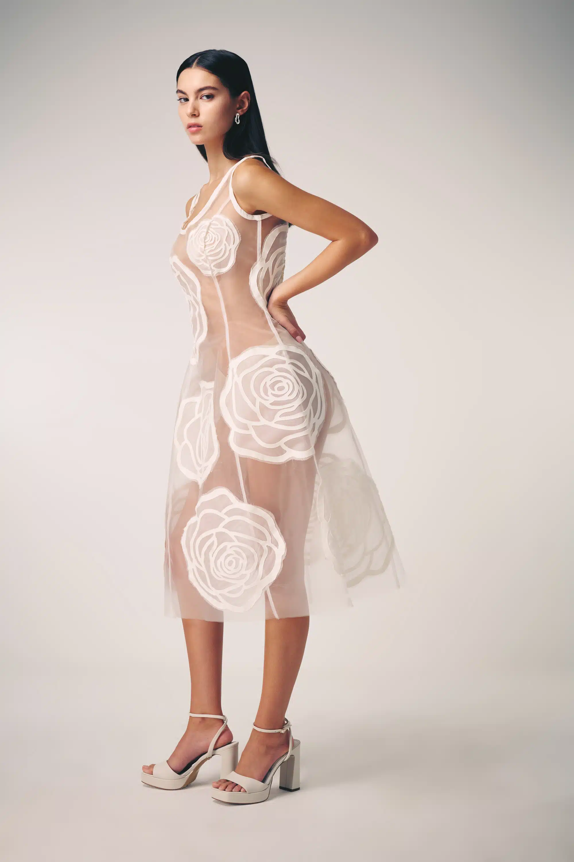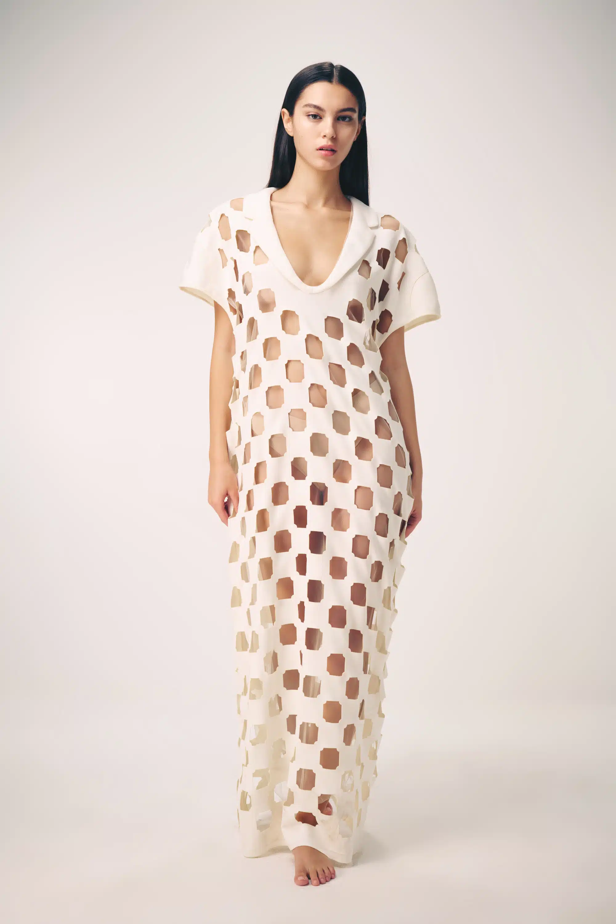 The collection artistically combines complex laser-cut geometric and organic motifs (such as roses and grid patterns) with soft, sheer, and airy fabrics. Using this singular technique, each piece is meticulously constructed to create a phantom-like floral appearance and elegantly accentuate the female silhouette through sophisticated transparency.