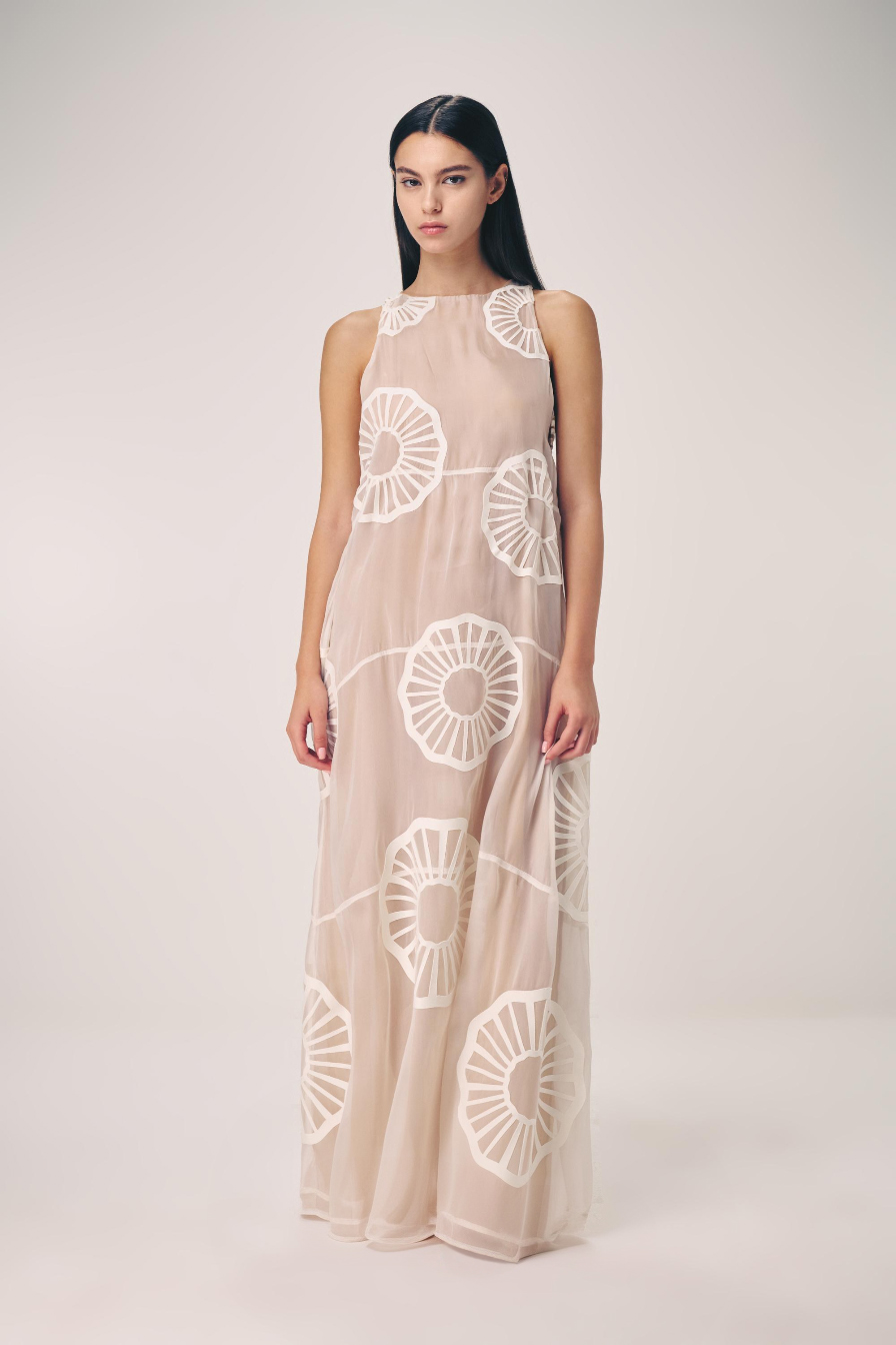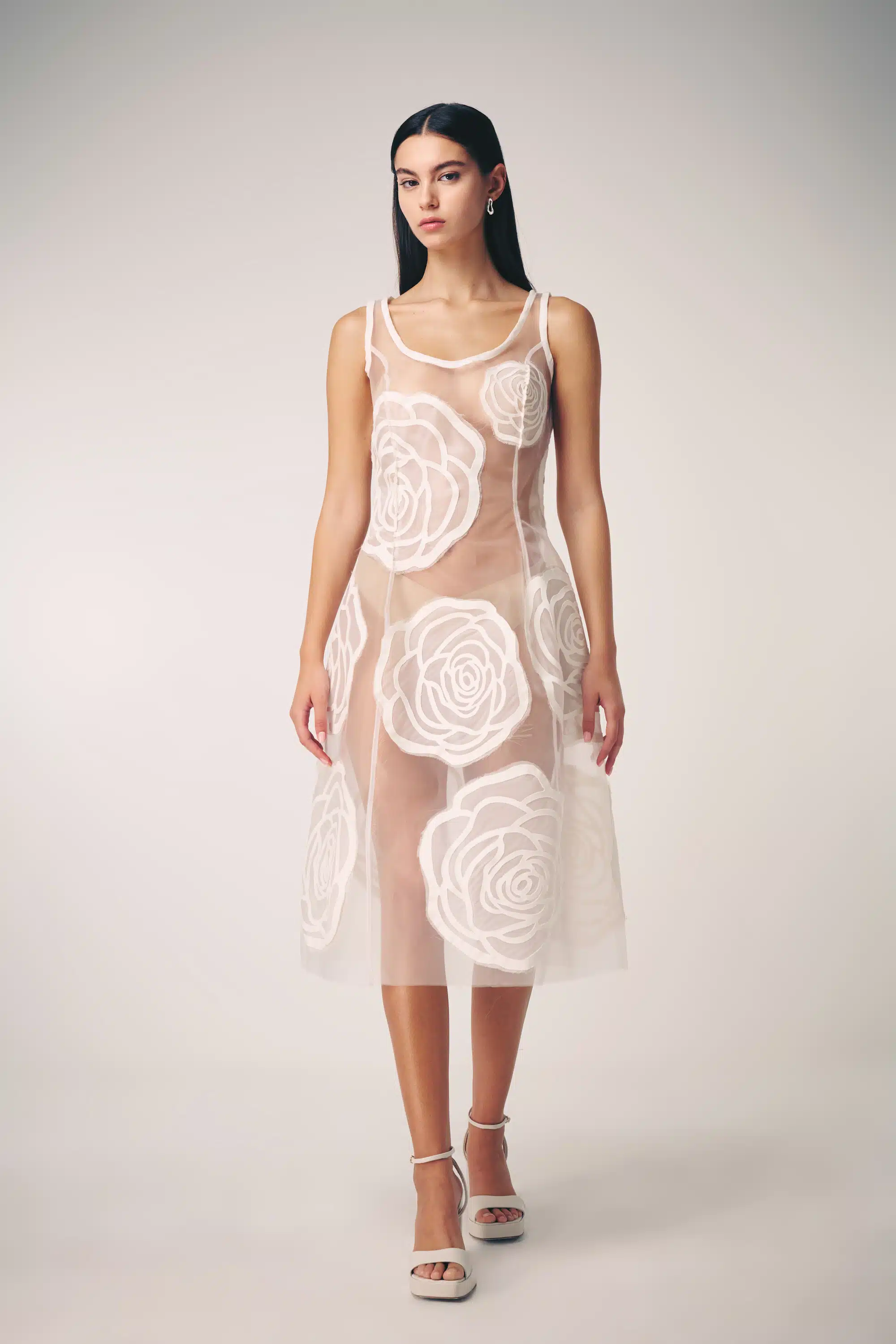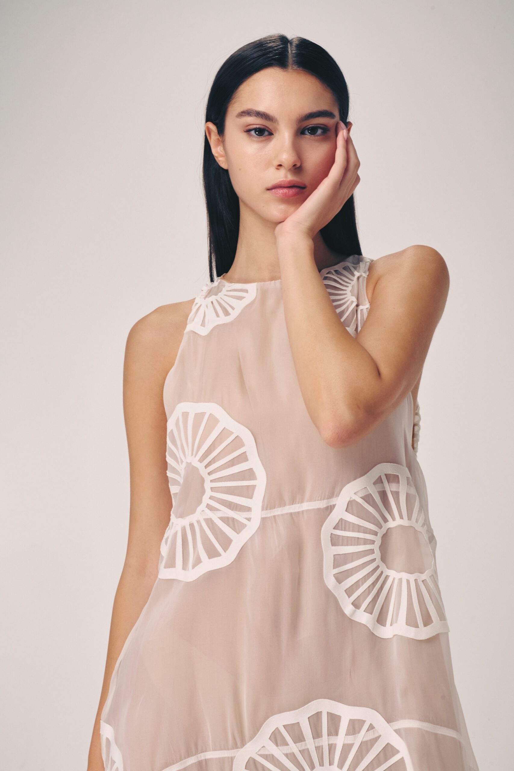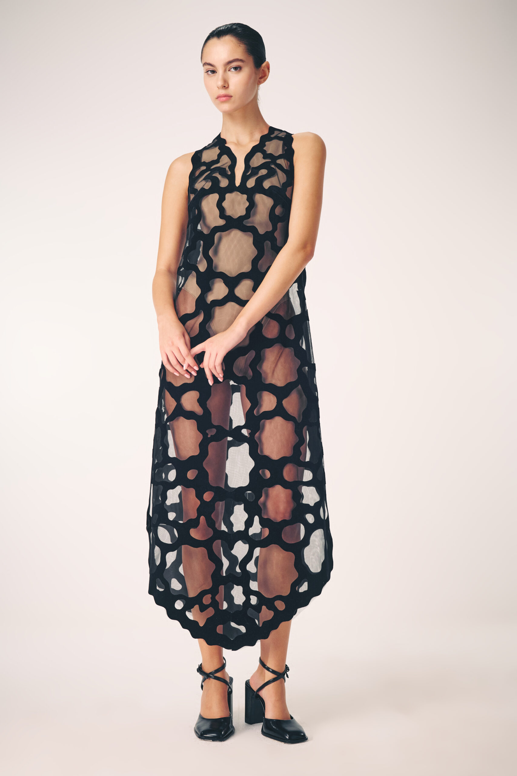 The collection artistically combines complex laser-cut geometric and organic motifs (such as roses and grid patterns) with soft, sheer, and airy fabrics. Using this singular technique, each piece is meticulously constructed to create a phantom-like floral appearance and elegantly accentuate the female silhouette through sophisticated transparency.