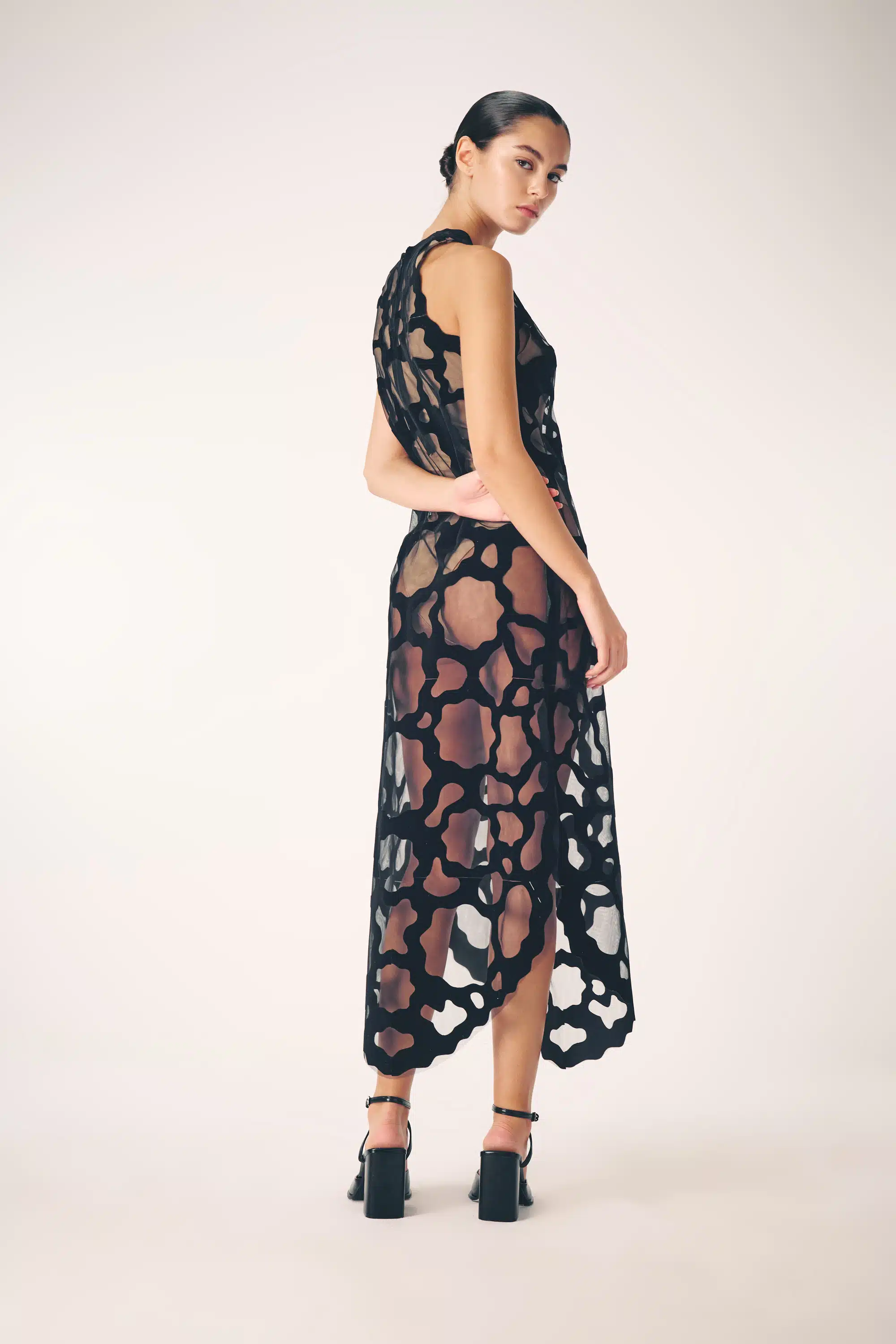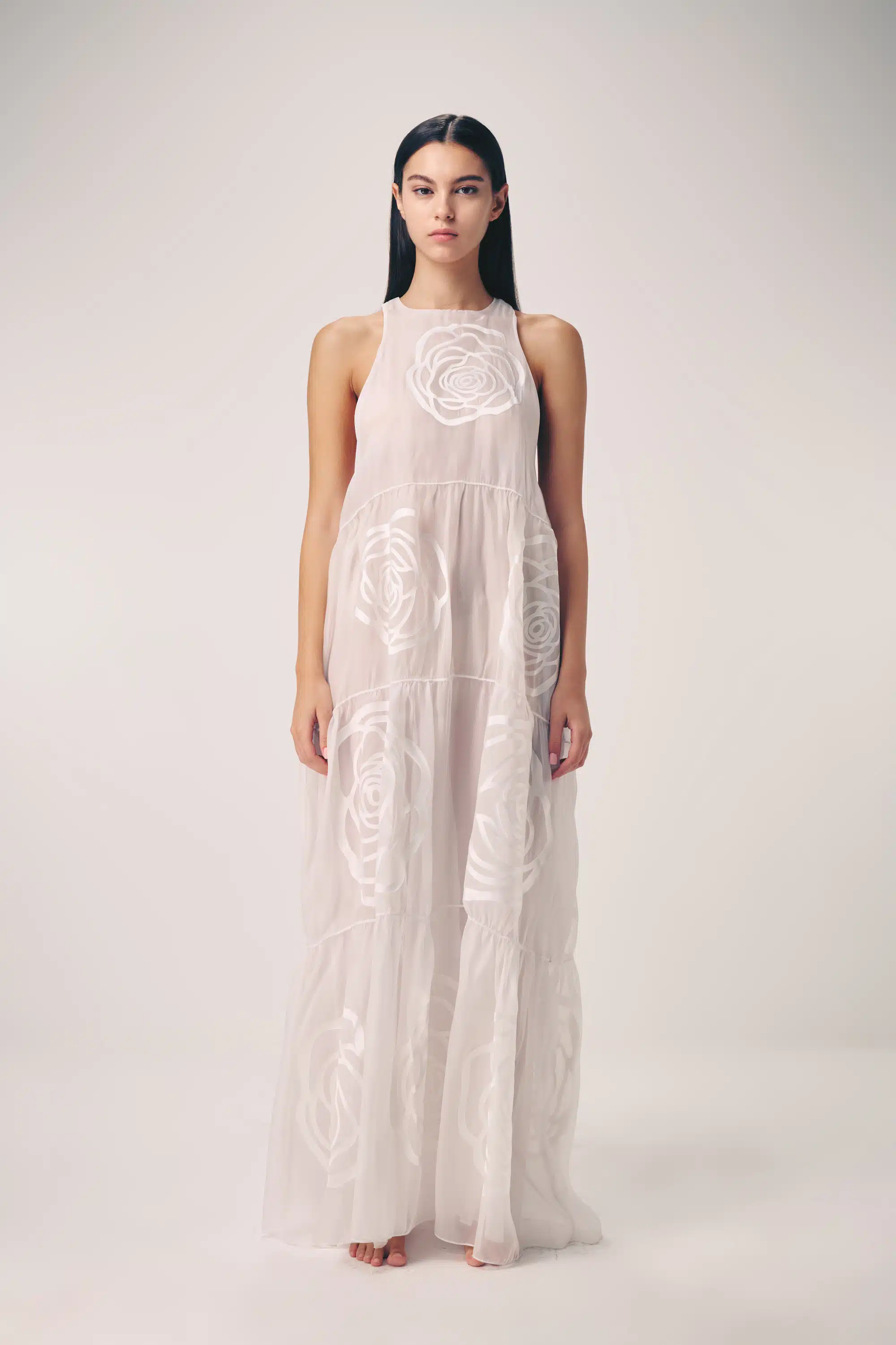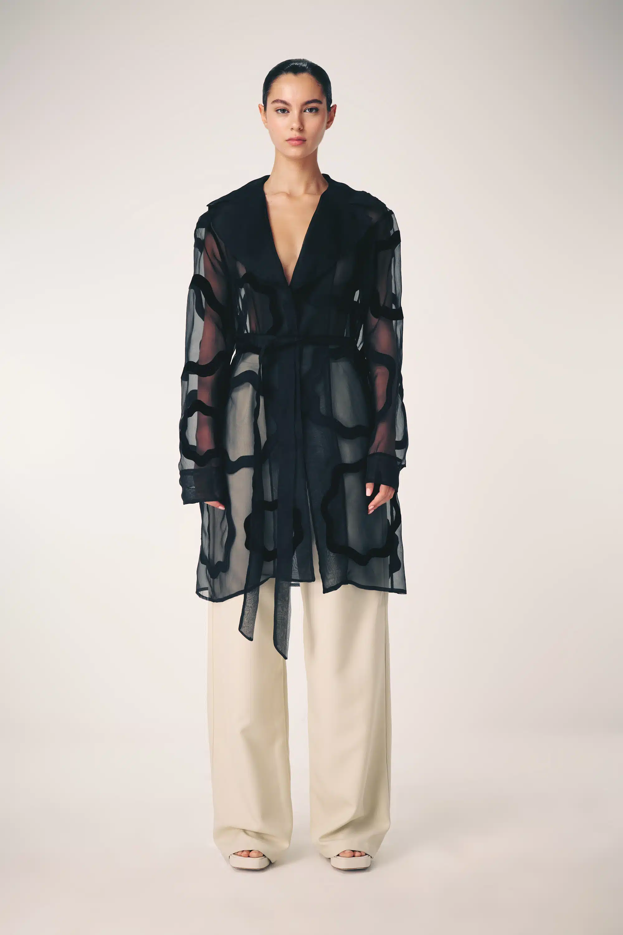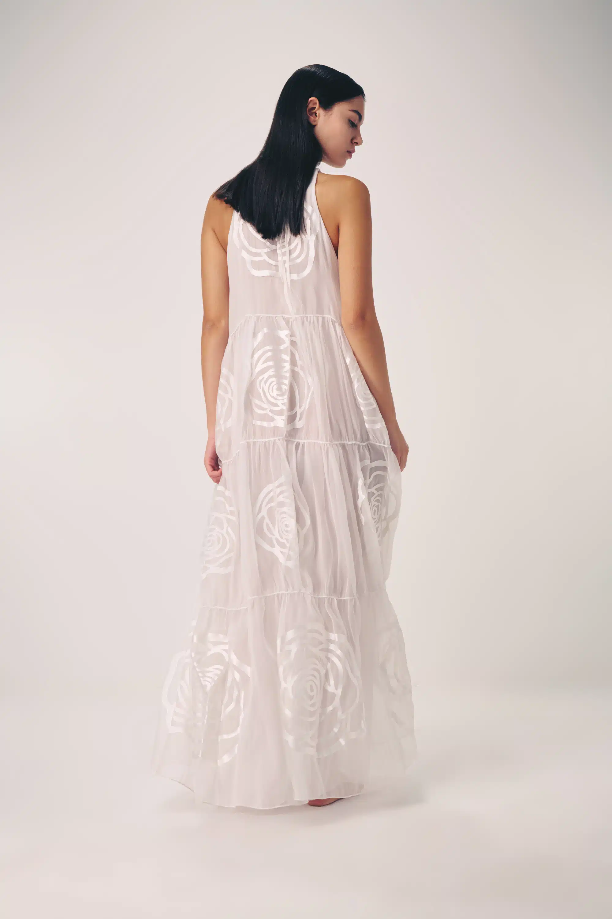 The collection artistically combines complex laser-cut geometric and organic motifs (such as roses and grid patterns) with soft, sheer, and airy fabrics. Using this singular technique, each piece is meticulously constructed to create a phantom-like floral appearance and elegantly accentuate the female silhouette through sophisticated transparency.