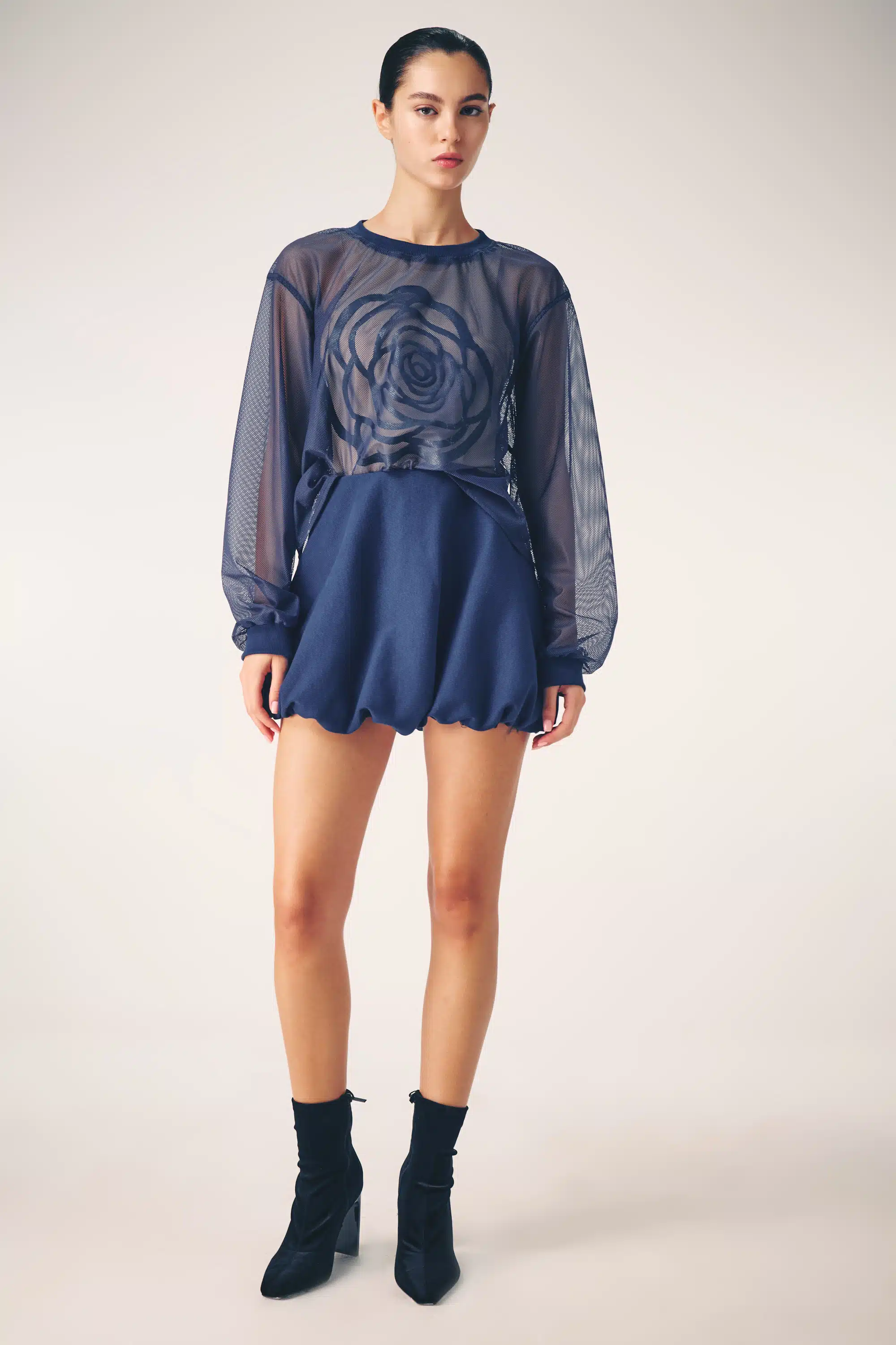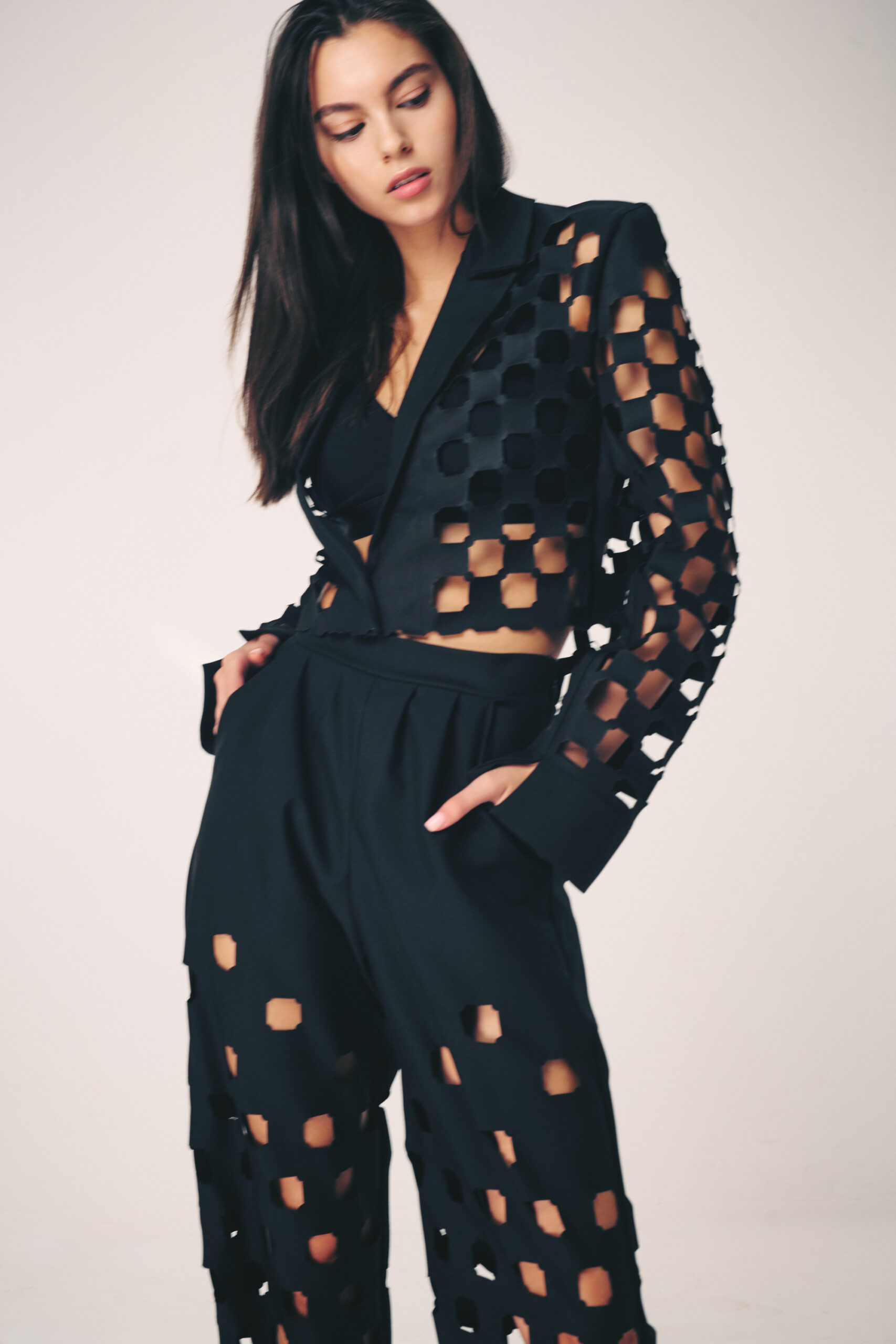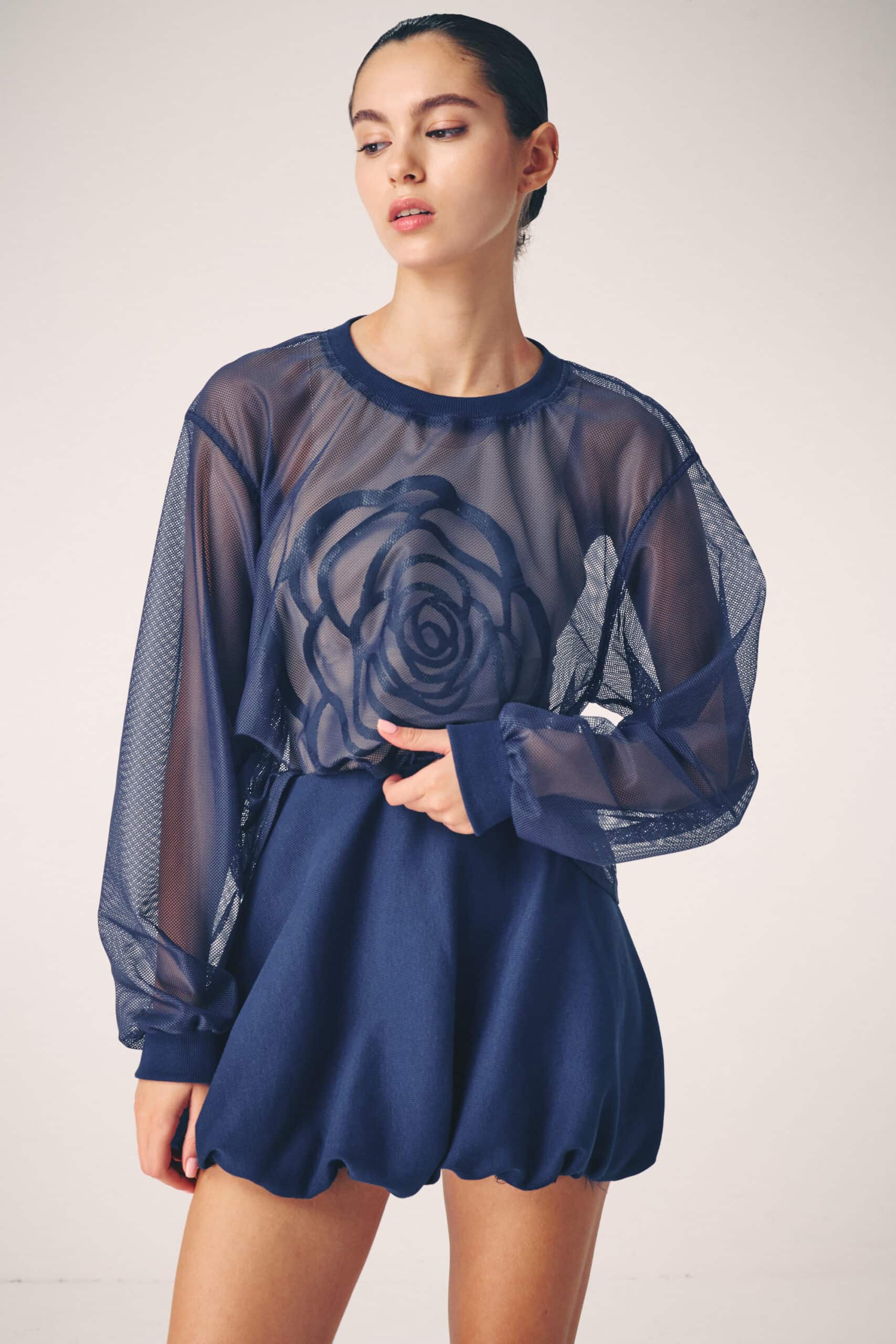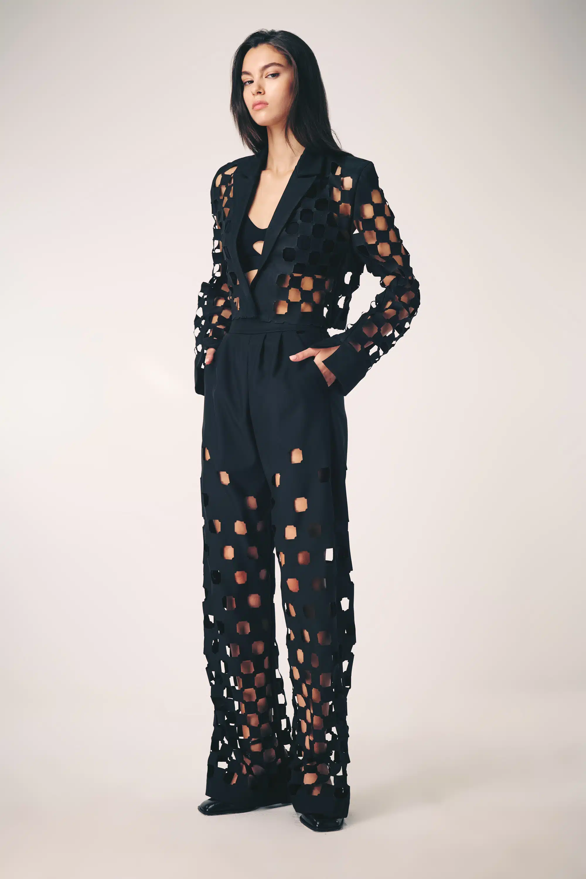 The collection artistically combines complex laser-cut geometric and organic motifs (such as roses and grid patterns) with soft, sheer, and airy fabrics. Using this singular technique, each piece is meticulously constructed to create a phantom-like floral appearance and elegantly accentuate the female silhouette through sophisticated transparency.